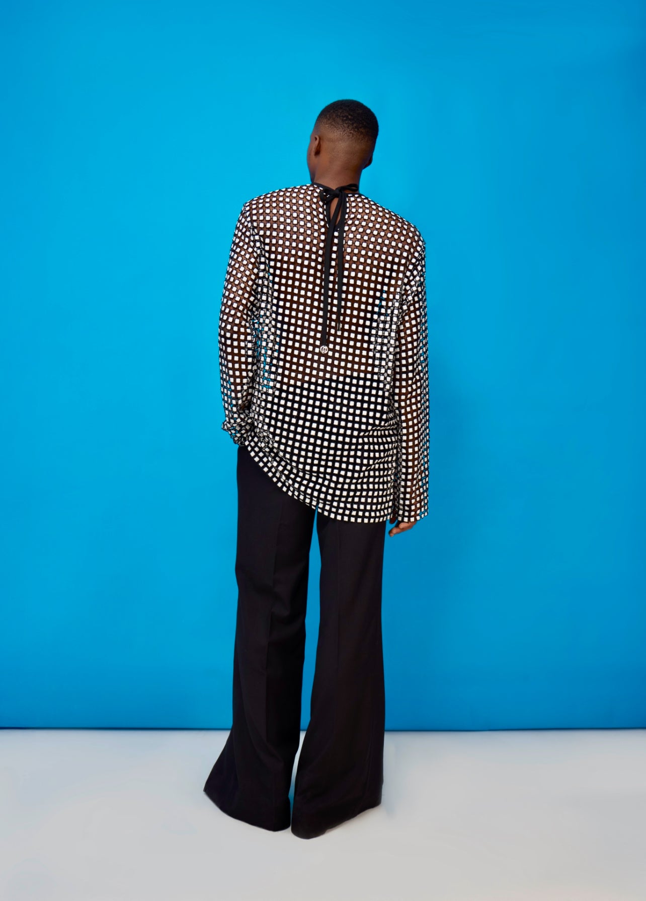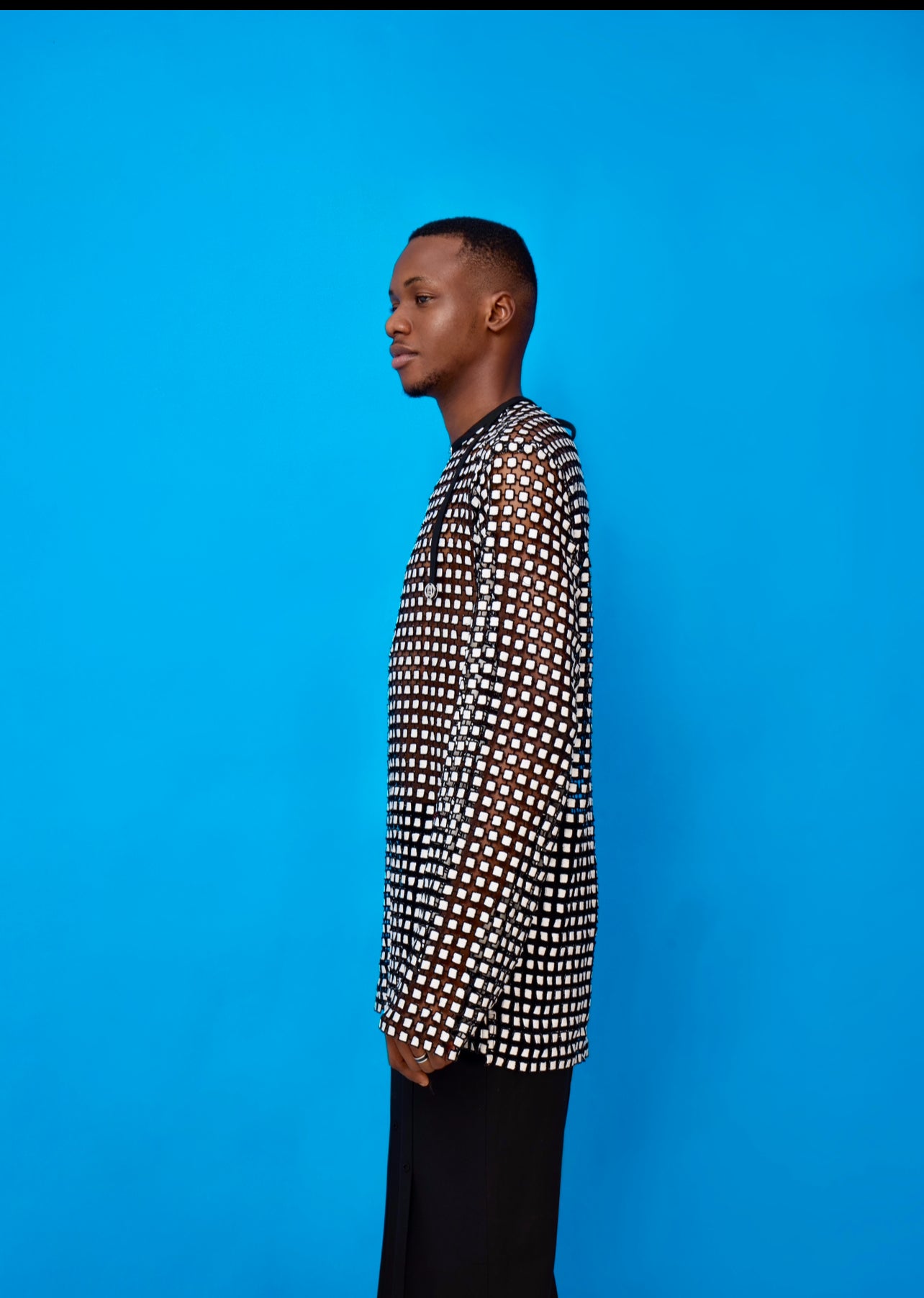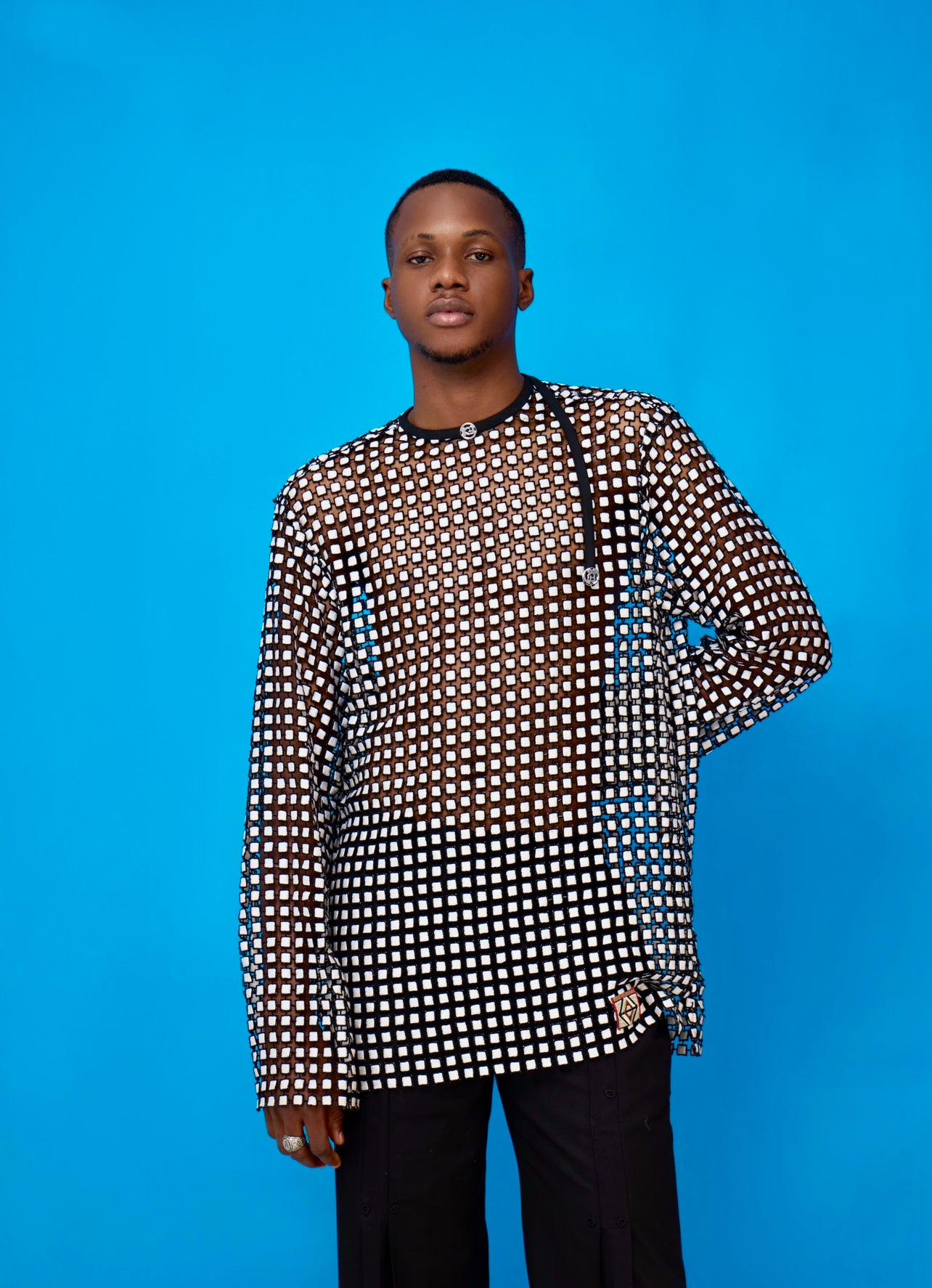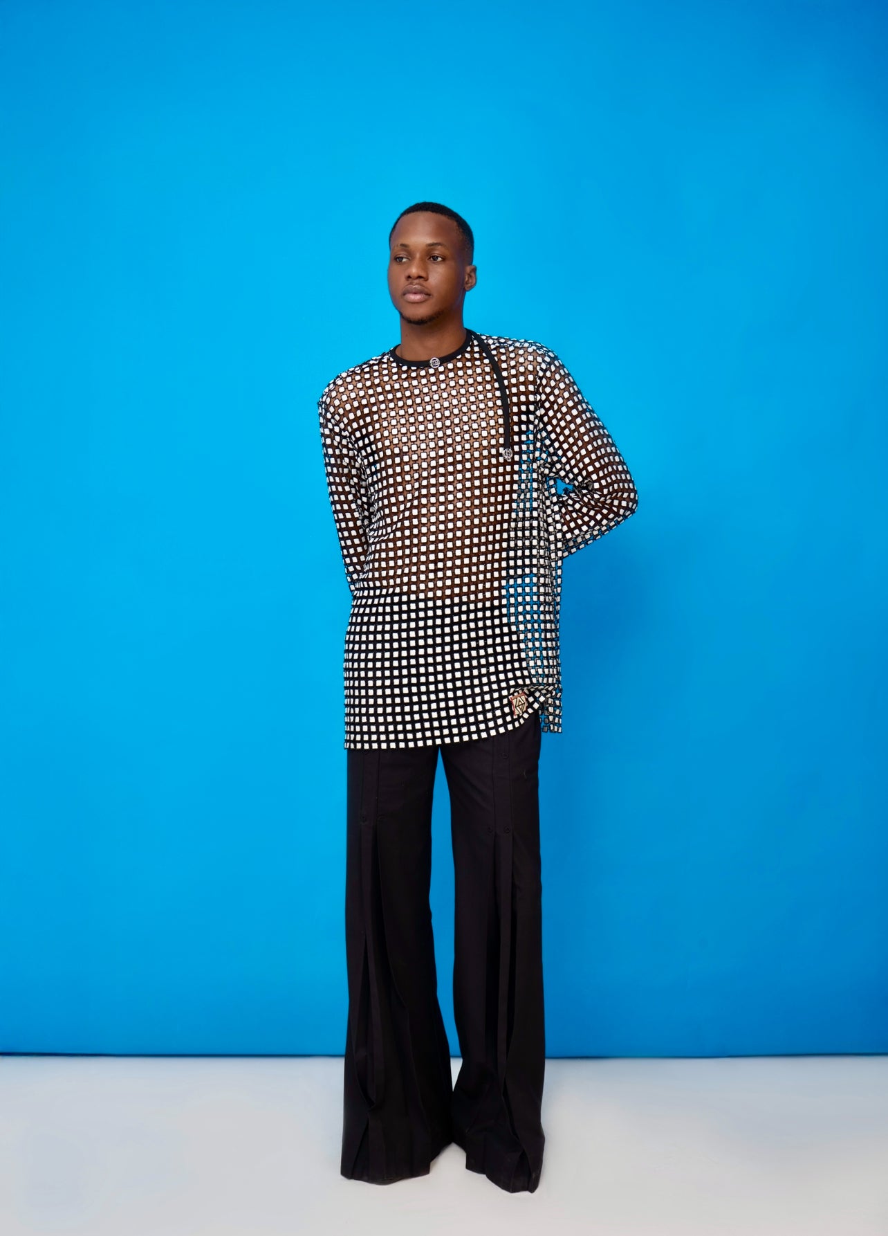 OSMOSIS 14reflects the seamless blending of cultures, ideas, and aesthetics. Made from premium quality cord lace and fine quality cotton suiting for the Japanese inspired trousers. .